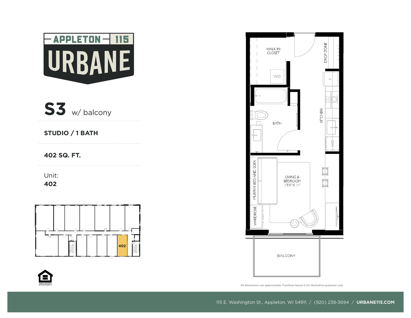 This is a studio unit in Urbane115. Urbane115 is a vibrant new apartment community nestled in downtown Appleton. This urban living experience provides opportunities to be steps away from: night markets, venues with live music, weekly farmers' markets and a growing culinary scene. The location is ideal for anyone looking for an urban lifestyle. Units are equipped with in-unit washer & dryer, dishwasher, and select units have balconies. A limited number of our studios also have murphy beds. Urbane115 is a pet-friendly property.